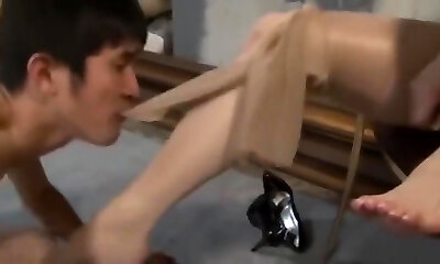 Beautiful Asian girl places her sexy leg on the guys rock-hard pecker