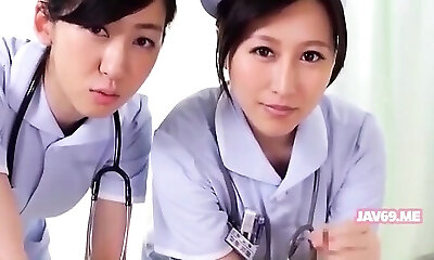 Japanese CFNM femdom duo gives hand-job with cumshot