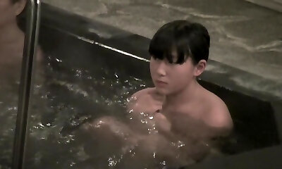 Some Japanese dark-hued haired gals have nothing being fingered in the pool
