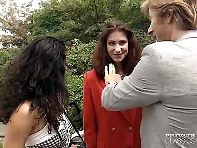 Clothed erotic pornographic stars deepthroat one penis and take turns riding it